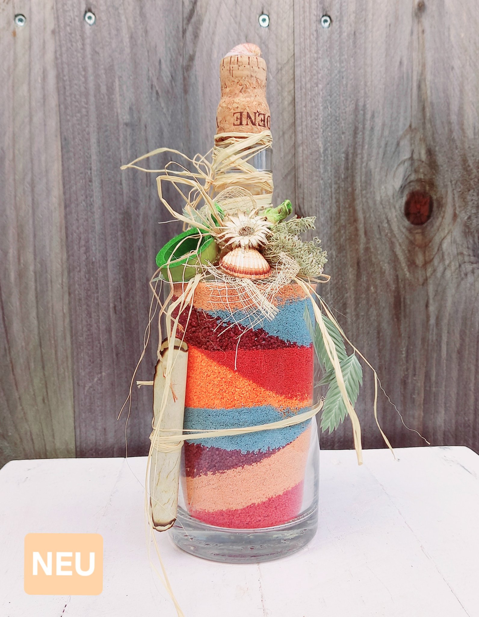 Wir basteln eine Flaschenpost! Du wirst verschiede farbige Schichten von Sand und Dekosteinchen abfüllen und die Flasche noch maritim dekorieren. Die Flaschenpost wird mit einem persönlichen Brief bestückt.