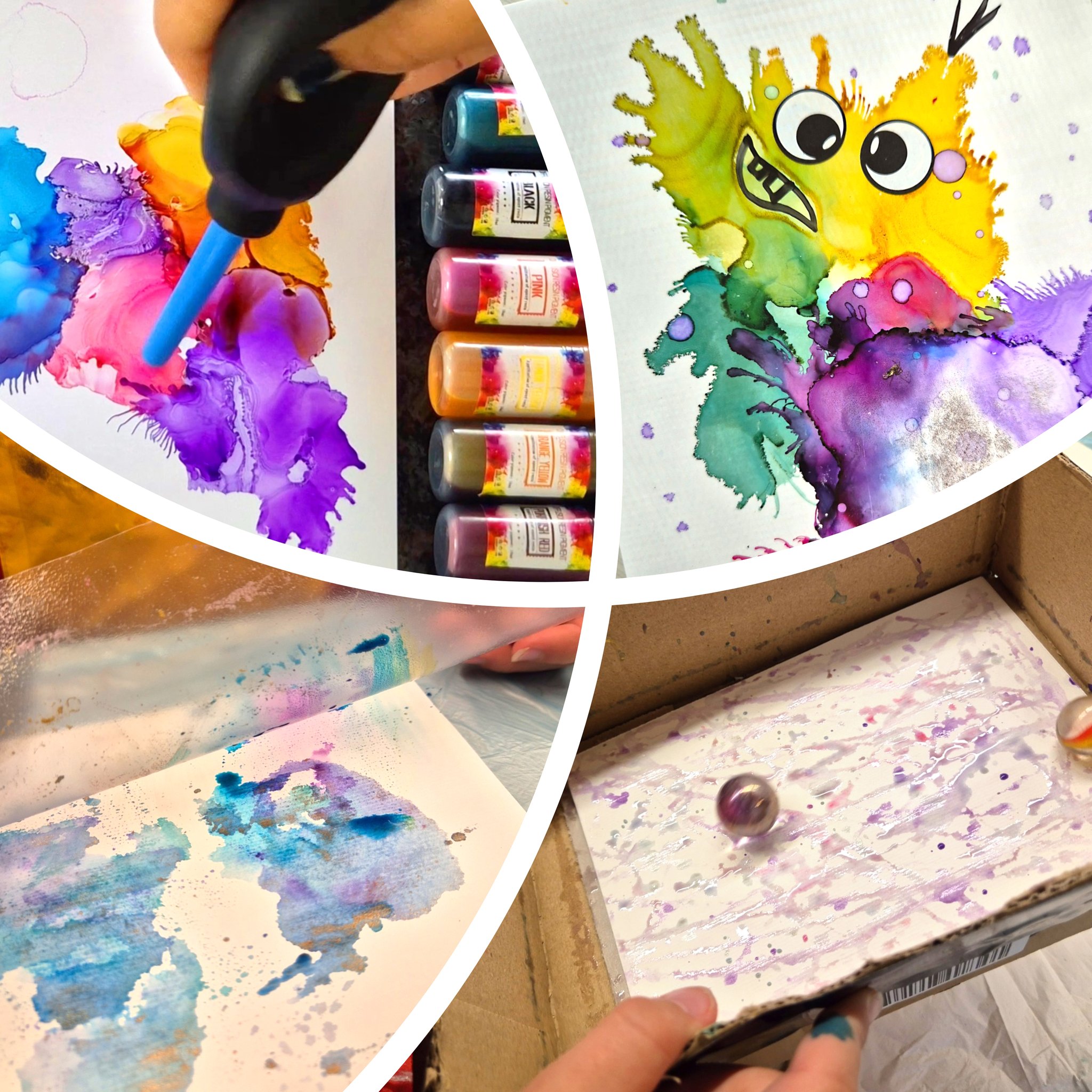 Die Kreativ-Tinten werden auf die Postkarten getropft. Mit der Hand-Luft-Pumpe bringst du die Flecken in Form. Daraus können auch mit Augen und Mund lustige Monster entstehen.