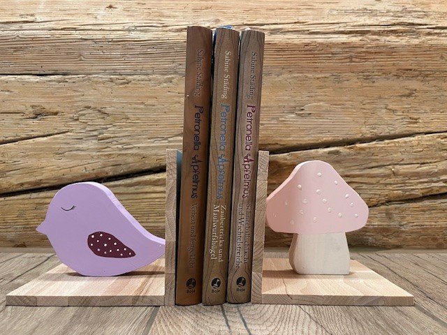 Nachdem du die einzelnen Klötzchen zusammengeklebt hast, kannst du deine Buchstützen ganz nach deinem eigenen Geschmack gestalten und dekorieren. Es stehen dir verschiedene Holztiere/Pilze und viele Farben zur Auswahl!