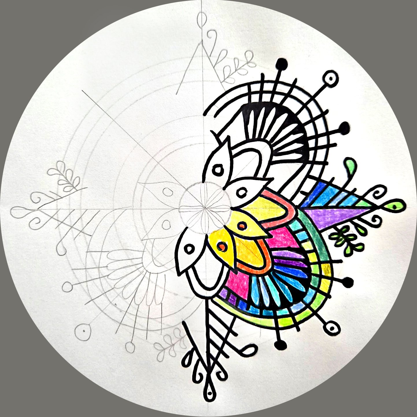 Mit Zirkel oder Schablone, Lineal und freien Formen entsteht dein eigenes Mandala auf rundem Papier.